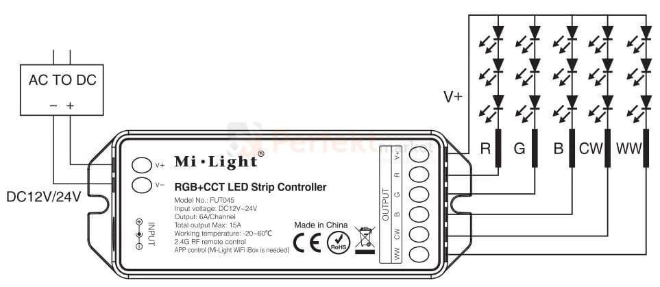 Odbiornik służy do zarządzania taśmami RGB+CCT z diodą RGB (wielokolorową) oraz CCT (dwukolorowa pozwalająca na zmianę temperatury barwowej).