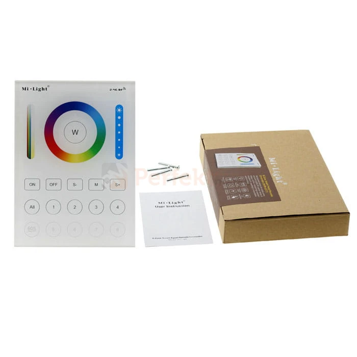 Dotykowy panel sterujący taśmami 5w1 8 strefowy. Dzięki kontrolerowi Mi Light B8 i odbiornikom LS2, FUT037S+ FUT037S, FUT037m, FUT038m, FUT039m mamy możliwość zarządzania taśmami LED w 8 niezależnych strefach (pokojach, pomieszczeniach) bezprzewodowo.