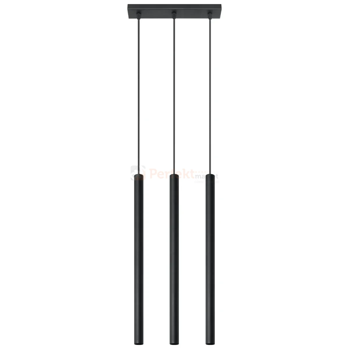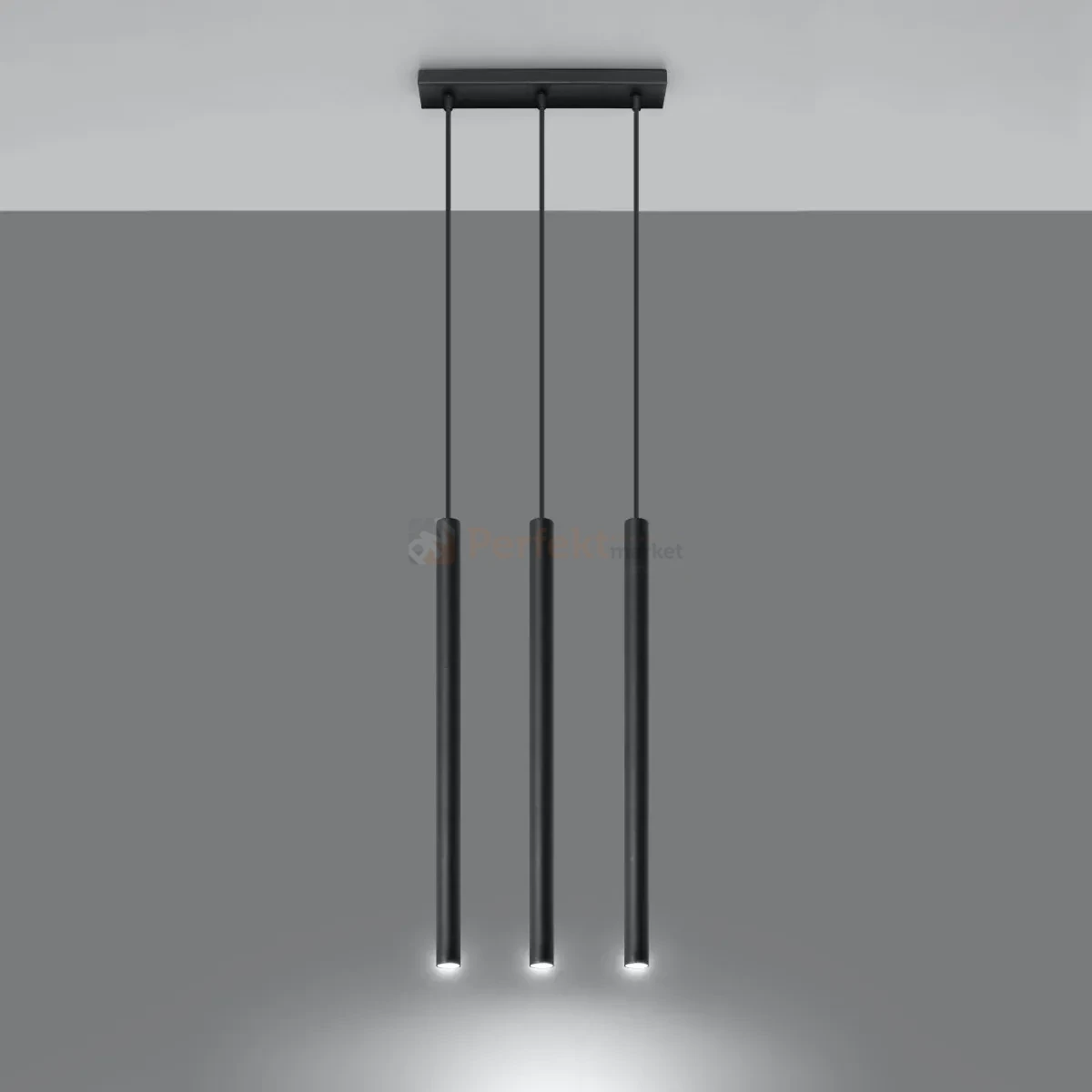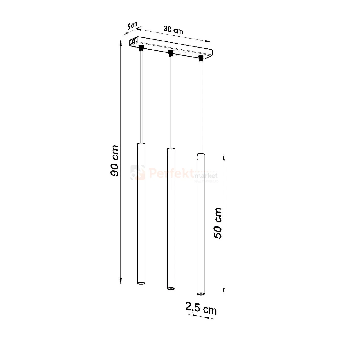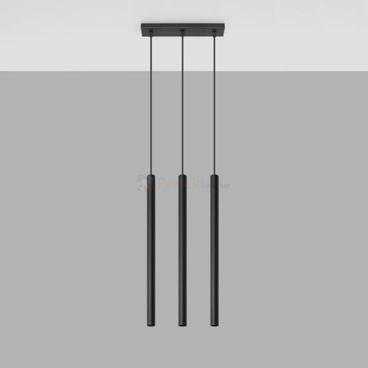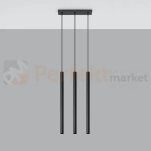 Konstrukcja oprawy opiera się na trzech smukłych, stalowych tubach wykończonych matową czernią, co nadaje aranżacji wyrazistego i nowoczesnego charakteru. Cylindryczny kształt kloszy sprawia, że oświetlenie staje się dyskretnym, a jednocześnie stylowym elementem dekoracyjnym pasującym do wielu stylów wykończenia.