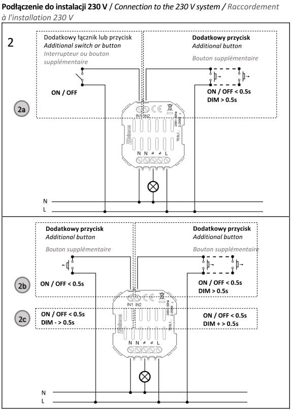 Ściemniacz ma wszystkie potrzebne do pracy przyciski, a dodatkowo możemy wysterować go dodatkowym przyciskiem/przyciskami z innych miejsc, dzięki czemu w prosty sposób tworzymy układ schodowy/korytarzowy. Za pomocą dodatkowego przycisku można zrealizować funkcję włącz/wyłącz lub włącz/wyłącz/ściemnij/rozjaśnij - zależy z którego dodatkowego zacisku skorzystamy.