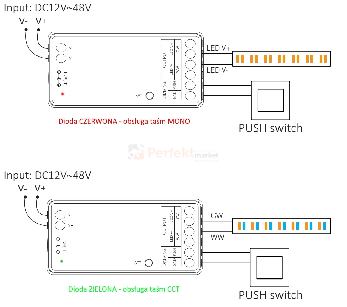 Sterownik dzięki wyjściu PUSH DIMM- pozwala na ściemnianie i rozjaśnianie taśmy LED za pomocą dowolnego przycisku zwiernego.