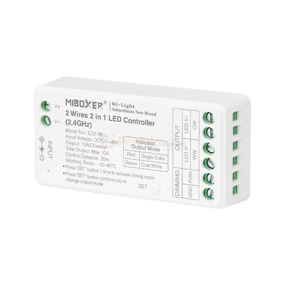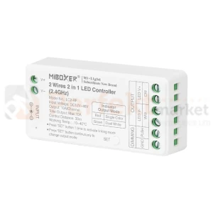 Moc odbiornika pozwana na podłączenie do 10 A (120 W przy instalacji 12 V i 240 W przy instalacji 24 V). Wbudowaną dioda sygnalizacyjna, pozwala na szybką diagnozę oraz przypisanie kontrolera do pilota bez podłączania taśmy LED. Sterownik działa ze wszystkimi pilotami i panelami MiBoxer, które posiadają funkcje włącz/wyłącz, jaśniej-ciemniej i CCT. Sterownik można również podłączyć do aplikacji Tuya Smart, za pomocą mostka WL-Box2.