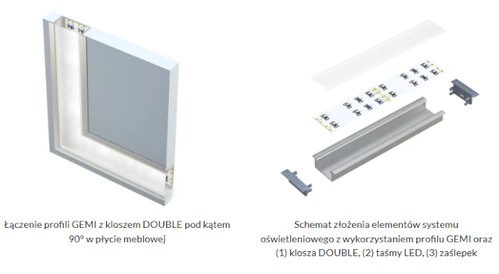 Schemat złożenia elementów systemu oświetleniowego z wykorzystaniem profilu GEMI oraz: