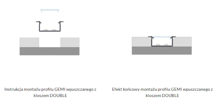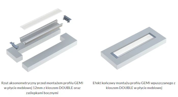 Profil LED GEMI to nowoczesne i funkcjonalne rozwiązanie do estetycznego montażu taśm LED w wyfrezowanych otworach. Dzięki szerokiej konstrukcji, umożliwia instalację dwóch taśm LED ułożonych równolegle, co pozwala uzyskać mocniejsze i bardziej równomierne oświetlenie.