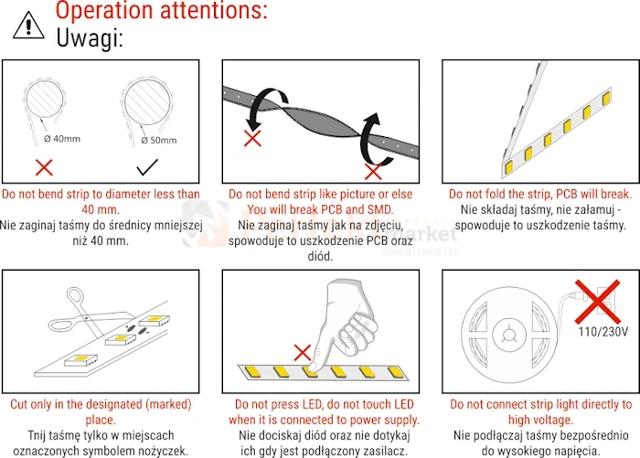 - napięcie 12V to możliwość podpięcia do 5 metrów taśmy w jednym ciągu.