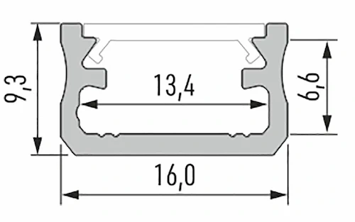 Profil wykonano z grubych ścianek aluminiowych, co zapewnia lepsze odprowadzanie ciepła niż w tańszych profilach, przekładając się na dłuższą żywotność zamontowanej taśmy LED. Wymiary profilu to 16 mm szerokości i 9,3 mm wysokości, co czyni go kompaktowym rozwiązaniem do zabudowy nawierzchniowej.