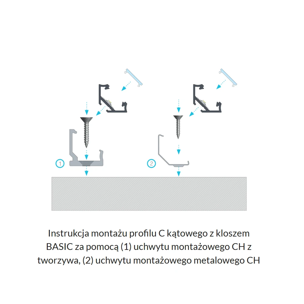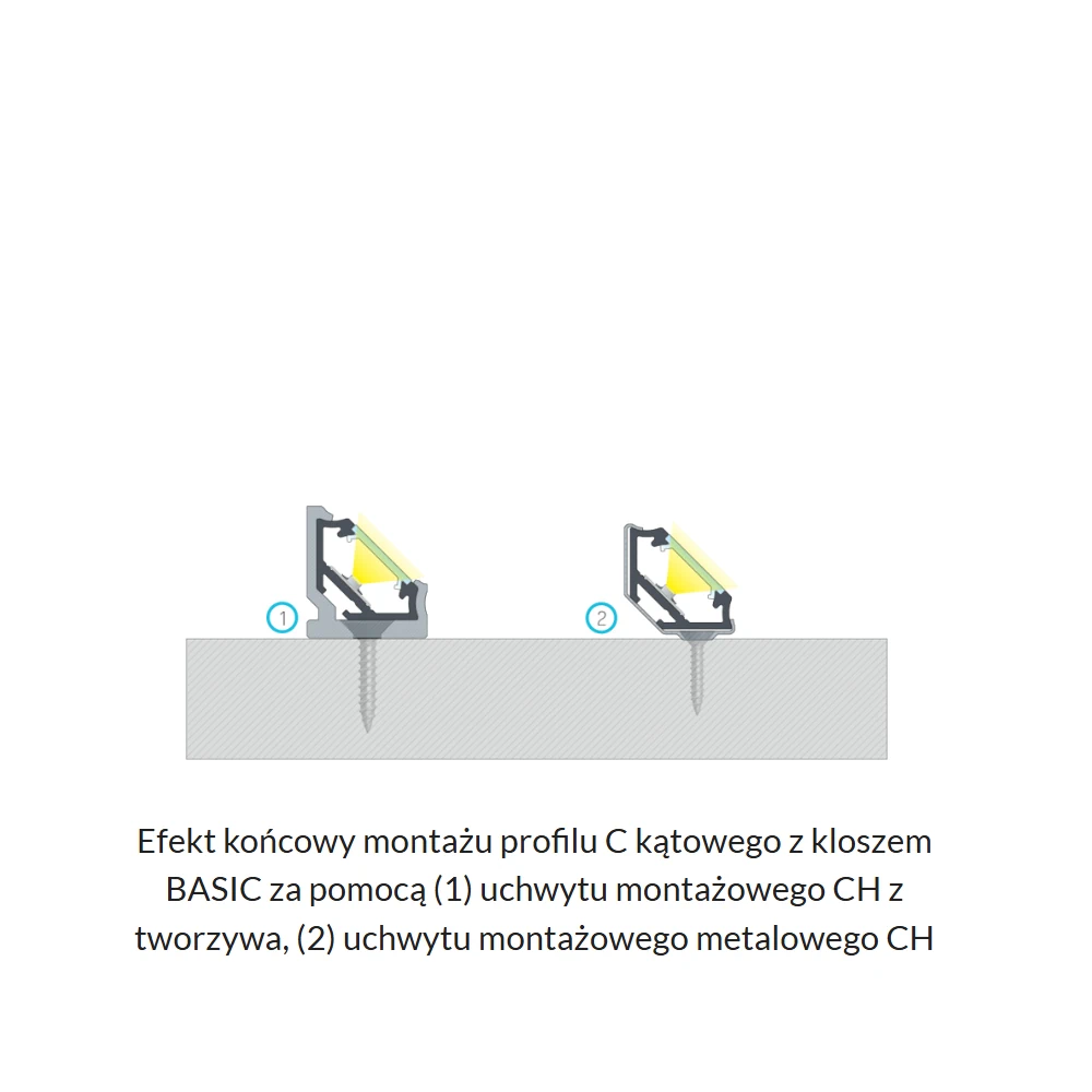 Montaż profilu LED można wykonać na taśmę dwustronną, wkręty lub przy użyciu uchwytów montażowych (do dokupienia osobno), co daje wygodę i elastyczność w zależności od projektu.