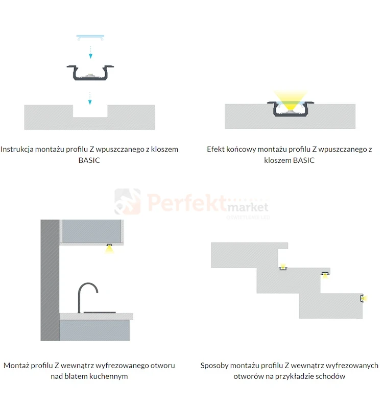 Zastosowania profilu obejmują oświetlenie dekoracyjne i funkcjonalne w meblach, witrynach ekspozycyjnych, wnękach architektonicznych oraz schodach.