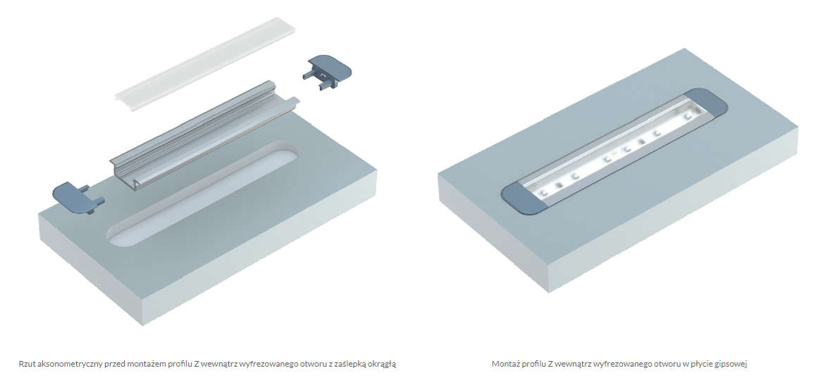 - Wybierz typ profilu – nawierzchniowy, wpustowy albo kątowy – mleczną osłonę, złączki i przewody.