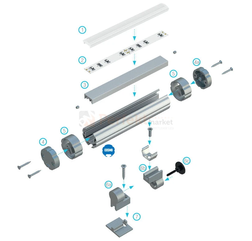 Schemat montażu elementów systemu oświetleniowego z wykorzystaniem profilu COSMO oraz:
