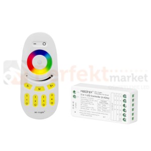 Kontroler LED 3w1 RGB, RGB+W / RGB+WW Mi Light w zestawie: pilot i odbiornik 3w1 do 1 strefy. Możliwość dokupienia odbiorników i skonfigurowania aż do 4 stref oświetlenia sterowanych 1 pilotem.